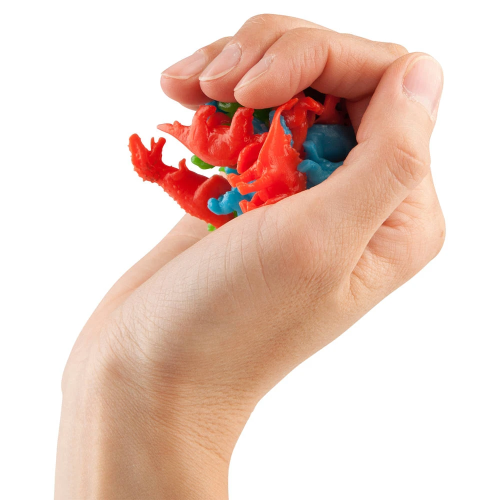 Gigantisch, groot en gevaarlijk? Nee! Deze Dino World kruip dino’s zijn klein, plakkerig en kruipen graag! Pak de kruip dino’s vast en gooi ze op een gladde muur of op het raam, de dino’s kruipen langzaam naar beneden! Super cool! De kruip dino’s komen in de kleuren oranje, blauw en groen. Laat de dino’s overal kruipen, dat doen ze namelijk het liefst!