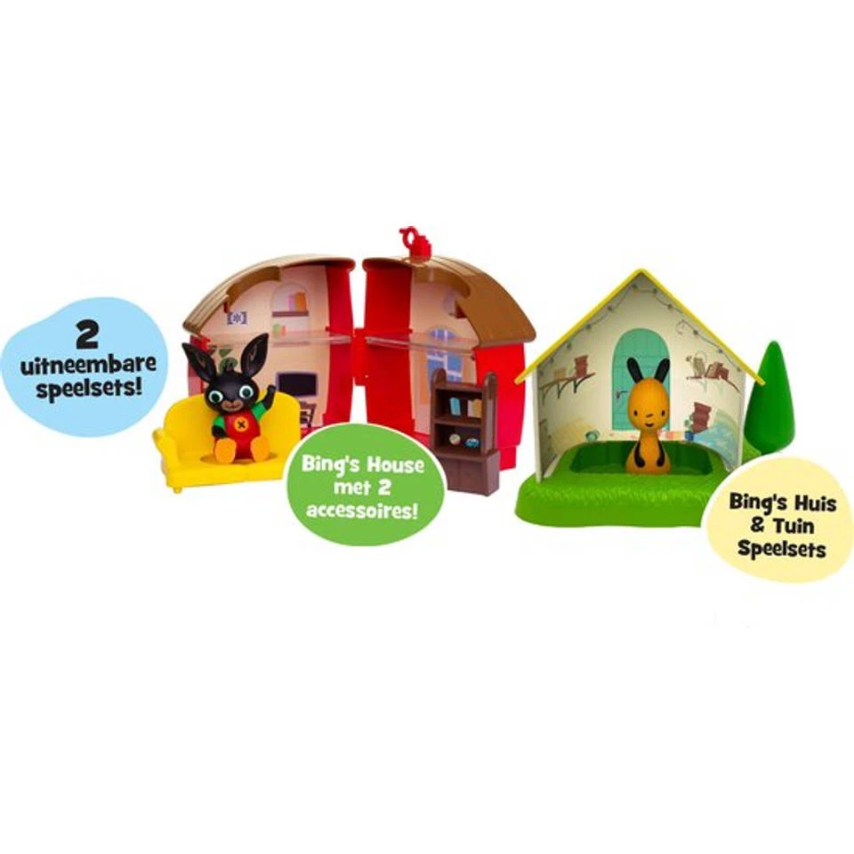 - Bings trein heeft twee rijtuigen met uitneembare speelsets, Bings Huis en Bings tuin en tuinhuis compleet met accessoires.