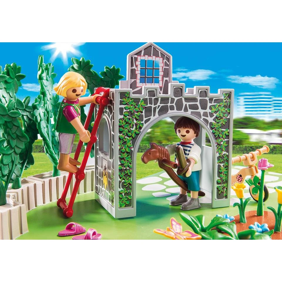Breng een zonnige middag door in deze gezellige familietuin met de PLAYMOBIL Country SuperSet. Terwijl mama ervoor zorgt dat alle planten voldoende water krijgen op deze zomerse dag, nemen de kinderen de zorg van alle lieve diertjes op zich. Hebben de konijntjes wel voldoende water en worteltjes gekregen? Zodra iedereen klaar is met zijn of haar taken, rennen de kinderen snel terug naar hun zelfgebouwde kasteel om riddertje te spelen terwijl mama plaats neemt in haar ligstoel om van deze schitterende dag te genieten. Er zijn genoeg leuke avonturen te beleven in deze gezellige familietuin!
