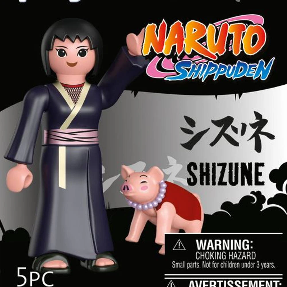 Shizune zorgt ook voor TonTon, Tsunades varken, als huisdier. Zij is een zeer vriendelijk en rustig persoon, maar zal Tsunade onmiddellijk te hulp snellen en wordt daarentegen fel en enigszins meedogenloos; een bewijs van haar loyaliteit aan Tsunade, inclusief het verliezen van haar humeur als iemand haar beledigt. De Playmobil-set toont Shizune in een donkerblauwe kimono met kort zwart haar. Aan haar zijde staat TonTon het geluksvarken.